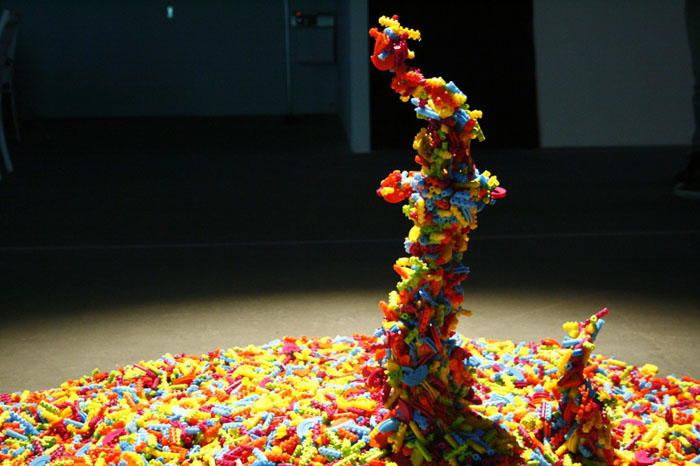A partir do tema auto-retrato, ao me apropriar do brinquedo educativo "pino mágico", eu penso questões que perpassam o erro, a incompletude, a incerteza, o imprevisto, a instabilidade. Adenso as minhas reflexões sobre o jogo e suas interações que visam metas e objetivos. Nessa escultura em processo: um "monstro multiforme e colorido" com proporções e medidas próximas as minhas tem-se uma mixagem analógica, onde o ato de soldar torna-se preponderante, uma tarefa que acontece em etapas, em diferentes dias durante as semanas de exibição do trabalho. Com um maçarico de cozinha (a base de gás azul /gás butano) vou soldando os 20 mil pinos esparramados pelo piso do espaço expositivo. Esse trabalho em progresso pretende se um ser que agrega fragmentos, fogo e cor. Um ser descontínuo, um ser vacilante e sem polaridades, um ser passível de desmoronamento.